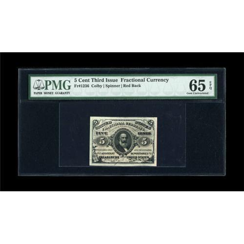 <B>Fr. 1236 5c Third Issue PMG Gem Uncirculated 65 EPQ.</B></I> Behemoth margins are noticed on this pleasing Red Back Clark that exhibits trace press bed smearing.<BR><BR><b>Shipping:</b> Coins & Currency (<a target="_blank" href="http://www.heritageauctions.com/common/shipping.php">view shipping information</a>)