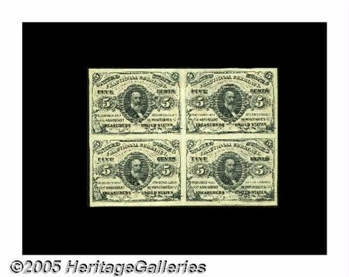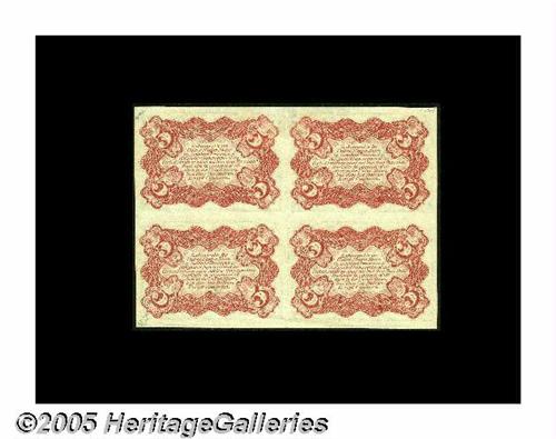<B>Fr. 1236 Milton 3R5.1 5¢ Third Issue Block of Four Choice About New.</B></I> An extremely rare Red Back multiple that was previously owned by Maurice Burgett. Burgett always wrote catalog numbers and his cost code in pencil in the back corners of his notes. This note has those pencil writings. These can be erased with ease and without a trace, but most collectors choose to allow them to remain. In any event, Red Back multiples are extremely rare, and this is a very nice one. The About New grade is due solely to the fold between the two pairs of notes, but each of the four notes individually is a broadly margined, fully bright piece with two Gems and two About News.