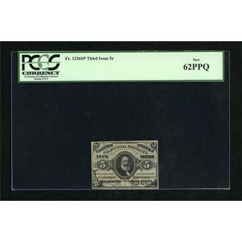 <B>Fr. 1236SP 5c Third Issue Narrow Margin Face PCGS New 62PPQ.</B></I> Dark bronze spells out "SPECIMEN" on the back of this Clark Specimen. <BR><BR><b>Shipping:</b> Coins & Currency (<a target="_blank" href="http://www.heritageauctions.com/common/shipping.php">view shipping information</a>)