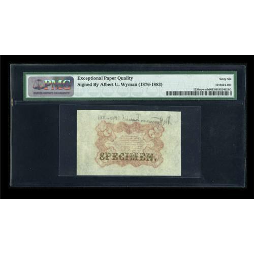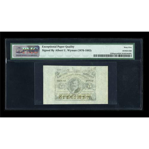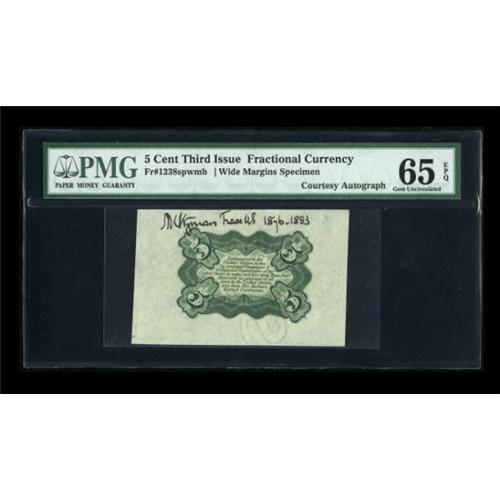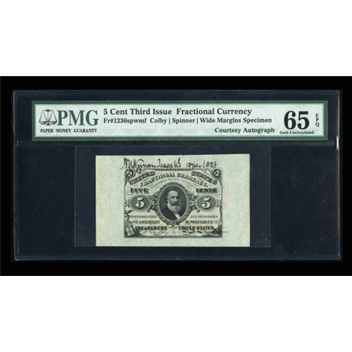 <B>Fr. 1236SP 5c Third Issue Wide Margin Set of Three Courtesy Autographed PMG Gem Uncirculated 65 & 66 EPQ.</B></I> All three notes from this very nice Wide Margin set have been autographed "AU Wyman Treas US 1876-1883." PMG has graded the Face <B>65 EPQ</B></I>, the Green Back <B>65 EPQ</B></I> and the Red Back<B> 66 EPQ</B></I>. All three courtesy autographs are bold and dark, and all three have clearly been applied at the same time. An exceptionally nice set.<BR><BR><b>Shipping:</b> Coins & Currency (<a target="_blank" href="http://www.heritageauctions.com/common/shipping.php">view shipping information</a>)