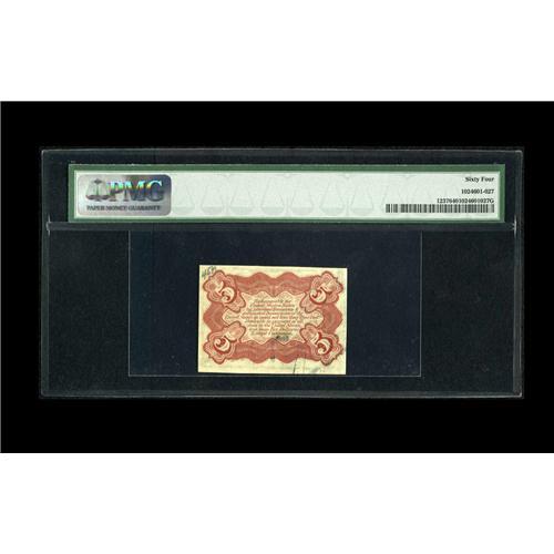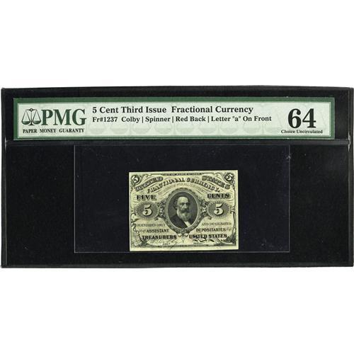 <B>Fr. 1237 5c Third Issue PMG Choice Uncirculated 64.</B></I> A lovely example of this much scarcer "a" on face red back Clark that is well margined with good eye appeal and fresh paper surfaces. This number becomes decidedly scarcer as one heads closer to the Gem grade.