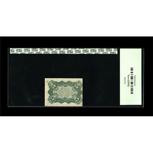 <B>Fr. 1238 5c Third Issue PCGS New 62PPQ.</B></I> This example was cut a little off on the back showing a portion of the note at left from back plate 28. A pencilled "37" is on the back.<BR><BR><b>Shipping:</b> Coins & Currency (<a target="_blank" href="http://www.heritageauctions.com/common/shipping.php">view shipping information</a>)