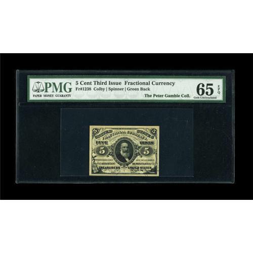 <B>Fr. 1238 5c Third Issue PMG Gem Uncirculated 65 EPQ.</B></I> Few examples of this issue show margins of this size. The front to back centering is ideal.<BR><I>From The Peter Gamble Collection.</B></I><BR><BR><b>Shipping:</b> Coins & Currency (<a target="_blank" href="http://www.heritageauctions.com/common/shipping.php">view shipping information</a>)