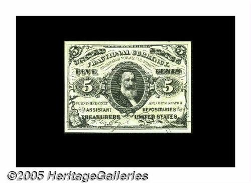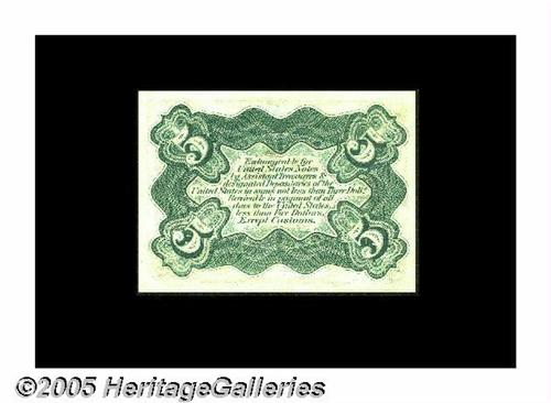 <B>Fr. 1238 Milton 3R5.2f 5¢ Third Issue Inverted Back Superb Gem New.</B></I> As fine a quality invert as any of any number that we've handled. The note is 100% perfectly centered on both sides, with broad margins all the way around. It also has all its original embossing, ideal colors and spectacular print quality. There are only about ten Clark Inverts known for all four numbers combined, with the majority being Fr. 1238's (six or seven). Milt's About New realized $550 eight years ago, and this piece should leave that number far, far behind. If you want a single spectacular Fractional Invert for your collection, pursue this piece whatever the cost.