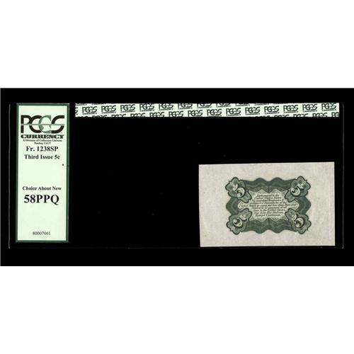 <B>Fr. 1238SP 5c Third Issue Green Wide Margin Reverse PCGS Choice About New 58PPQ.</B></I> This is a brightly colored specimen with nice bronzing and some light handling throughout the piece.