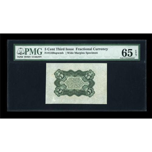 <B>Fr. 1238SP 5c Third Issue Wide Margin Back Specimen PMG Gem Uncirculated 65 EPQ.</B></I> This Clark Wide Green Back Specimen is quite nice, and desirable at this grade level.<BR><BR><b>Shipping:</b> Coins & Currency (<a target="_blank" href="http://www.heritageauctions.com/common/shipping.php">view shipping information</a>)