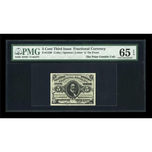 <B>Fr. 1239 5c Third Issue PMG Gem Uncirculated 65 EPQ.</B></I> A broadly margined, beautifully bright example that looks like it would be as equally at home in a 67 holder.<BR><I>From The Peter Gamble Collection.</B></I><BR><BR><b>Shipping:</b> Coins & Currency (<a target="_blank" href="http://www.heritageauctions.com/common/shipping.php">view shipping information</a>)