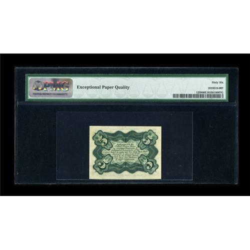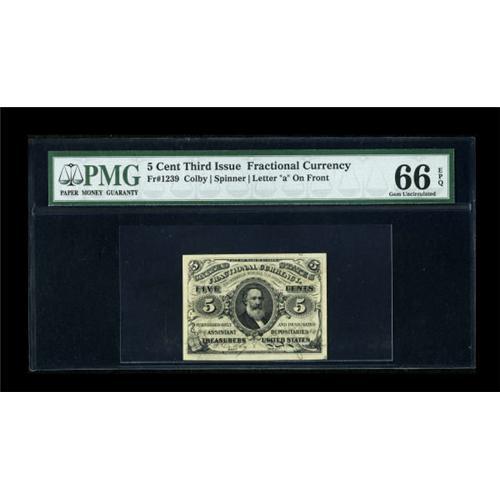 <B>Fr. 1239 5c Third Issue PMG Gem Uncirculated 66 EPQ.</B></I> This green back boasts boardwalk size margins and nearly perfect front to back centering. The finest example of this issue that we have handled in a few years.<BR><BR><b>Shipping:</b> Coins & Currency (<a target="_blank" href="http://www.heritageauctions.com/common/shipping.php">view shipping information</a>)
