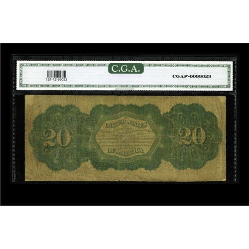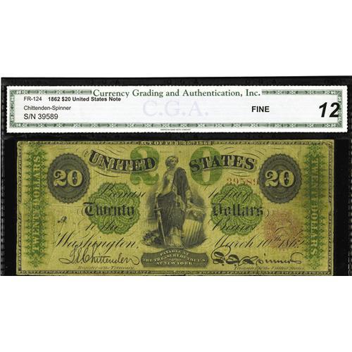 <B>Fr. 124 $20 1862 Legal Tender CGA Fine 12.</B></I> The colors remain bright and the note is certainly legible.