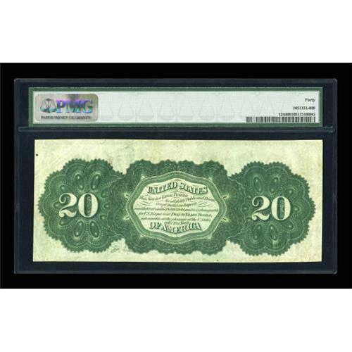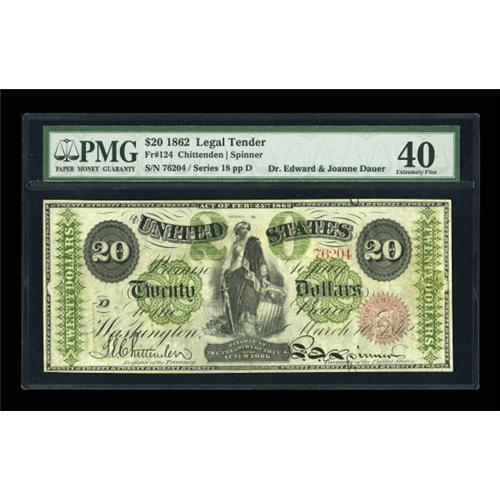 <B>Fr. 124 $20 1862 Legal Tender PMG Extremely Fine 40.</B></I> The Dauers upgraded to this lovely First Obligation note after their 2003 book was printed, and consequently this handsome piece does not appear. It was acquired by the Dauers at the 2004 Memphis auction for slightly over $14,000 - a number that will very likely be eclipsed this evening.<BR><I>From The Dr. Edward & Joanne Dauer Collection</B></I><BR><BR><b>Shipping:</b> Coins & Currency (<a target="_blank" href="http://www.heritageauctions.com/common/shipping.php">view shipping information</a>)