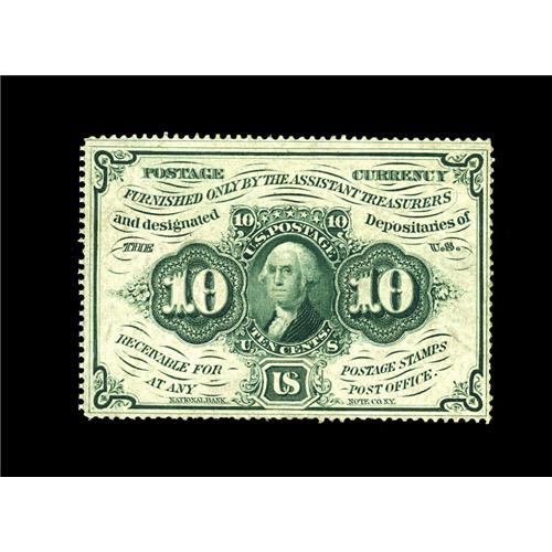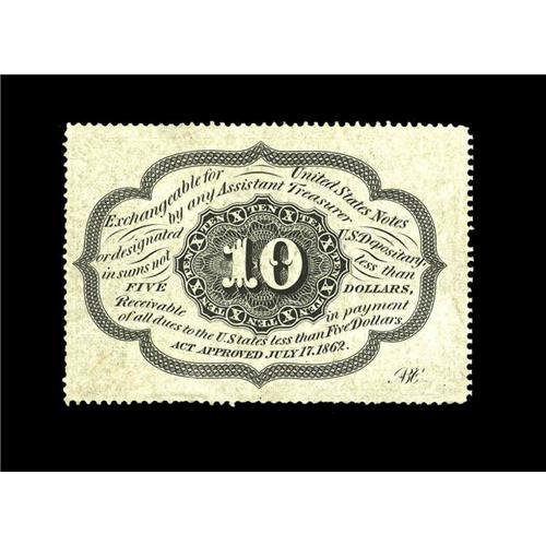 <B>Fr. 1240 10c First Issue Choice New.</B></I> This note is perforated on all four sides. The perforated version is much more scarce than the straight edge type of this design.