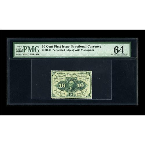<B>Fr. 1240 10c First Issue PMG Choice Uncirculated 64.</B></I> Full perforations all around are noticed with a touch of weakness in them at lower left.<BR><BR><b>Shipping:</b> Coins & Currency (<a target="_blank" href="http://www.heritageauctions.com/common/shipping.php">view shipping information</a>)