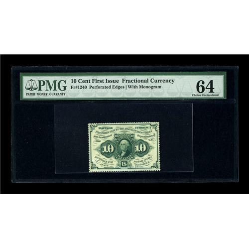 <B>Fr. 1240 10c First Issue PMG Choice Uncirculated 64.</B></I> This is a pleasing piece with full perforations all the way around. A little better back centering and this piece is Gem.<BR><BR><b>Shipping:</b> Coins & Currency (<a target="_blank" href="http://www.heritageauctions.com/common/shipping.php">view shipping information</a>)