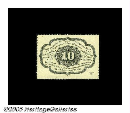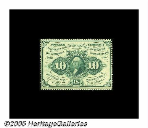 <B>Fr. 1240 Milton 1R10.3a 10¢ First Issue Gem New.</B></I> Crackling-fresh, beautifully printed and with Superb eye appeal, this note makes the Gem grade in spite of the perforations just touching the frame line. The perfs are full all the way around.