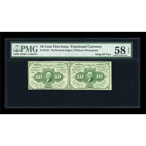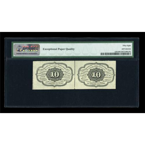 <B>Fr. 1241 10¢ First Issue Horizontal Uncut Pair PMG Choice About Unc 58 EPQ.</B></I> This horizontal pair of no monogram perforated 10¢ notes has earned the "Exceptional Paper Quality" designation from PMG. These are scarce notes individually, and very rare as a pair. The 58 grade apparently refers to the fold along the perfs that separate the two notes, as each appears Uncirculated individually. <BR><BR><b>Shipping:</b> Coins & Currency (<a target="_blank" href="http://www.heritageauctions.com/common/shipping.php">view shipping information</a>)
