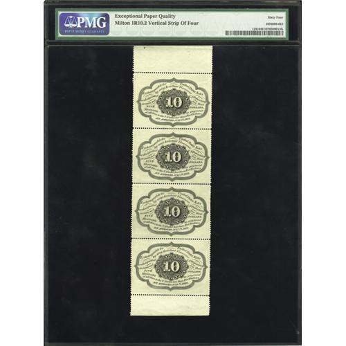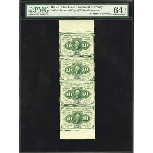 <B>Fr. 1241 10¢ First Issue Strip of Four PMG Choice Uncirculated 64 EPQ.</B></I> Mr. Mayer acquired this beautiful and very rare perforated strip at CAA's January 10, 1997 Milt Friedberg Collection Sale. It was described there, "An extreme rarity, as are all perforated strips. This flawless, as-issued offering is without a single torn or broken perforation. The wide selvage strips from the top and bottom of the sheet remain tightly attached." These four individual notes would be well worth a total of $5000 or more on the current market, but the real value here is the pristine, irreplaceable strip. (7500-up)<BR>From the Currency Auctions of America January 10, 1997 Milt Friedberg Sale Lot 490. Previously from NASCA's January 15, 1977 auction Lot 3289.<BR><I>From The Frederick Mayer Collection</B></I><BR><BR><b>Shipping:</b> Coins & Currency (<a target="_blank" href="http://www.heritageauctions.com/common/shipping.php">view shipping information</a>)