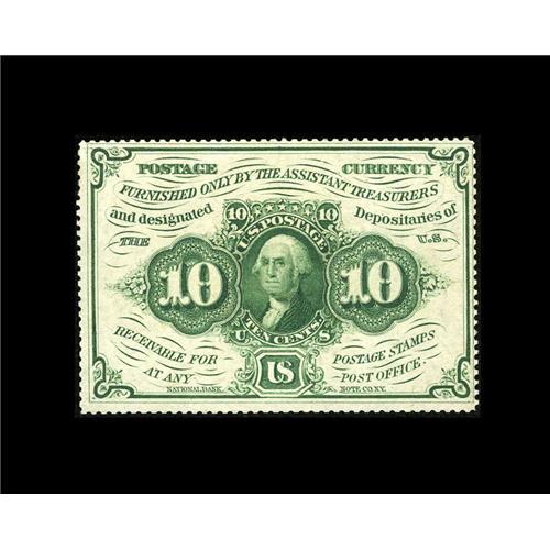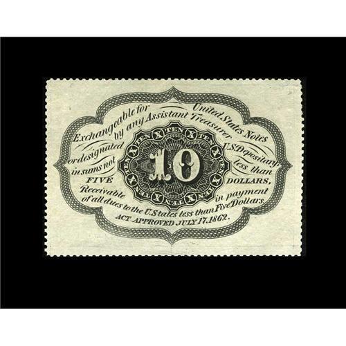 <B>Fr. 1241 10c First Issue Very Choice New.</B></I> Fully and deeply perforated all the way around, and with terrific paper color and ideal back centering. The face centering is just a bit short of perfect; otherwise, this note would grade Superb. This perforated, no-monogram note is about three times rarer than the already scarce Fr. 1240, and this is one of the nicer examples we've seen.<BR><BR><b>Shipping:</b> Coins & Currency (<a target="_blank" href="http://www.heritageauctions.com/common/shipping.php">view shipping information</a>)
