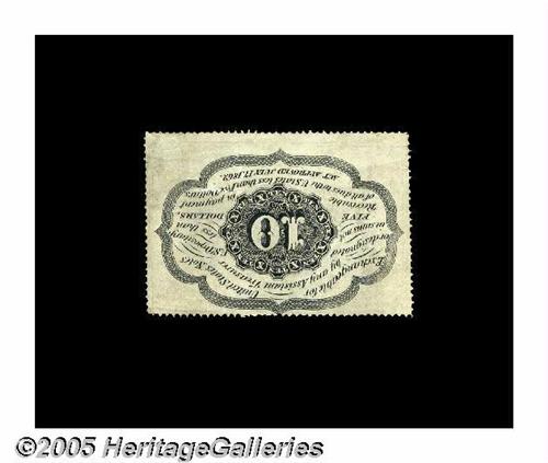 <B>Fr. 1241 Milton 1R10.2c 10¢ First Issue Inverted Back Extremely Fine.</B></I> Listed as unique in the Encyclopedia, where it appears as the plate note on page 35. It's a clean, well-perforated note that holds its light circulation quite nicely. All perforated Inverts are rare, with only nine examples in total, four of which are 25¢ notes. This Fr. 1241 remains unique per Tom's 2002 article, and it is the only Invert for either Friedberg number of Ten Cent Perforated Notes.