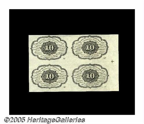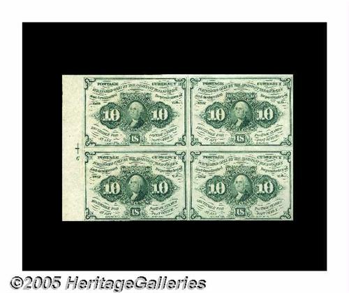 <B>Fr. 1242 10¢ First Issue Block Of Four Gem New.</B></I> Four perfect pieces in absolutely pristine condition. They have their full sheet selvage at the left which contains the plate number 6.