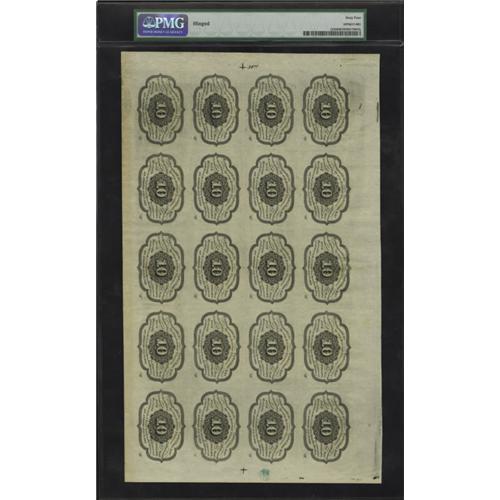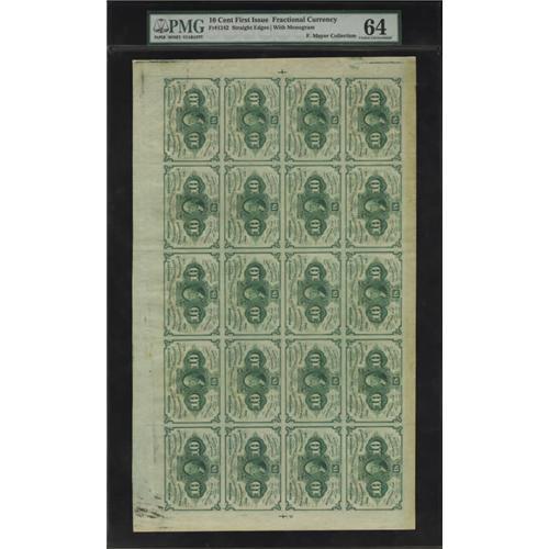 <B>Fr. 1242 10¢ First Issue Complete Sheet of 20 PMG Choice Uncirculated 64.</B></I> With the rapidly increasing prices for Superb notes, sheets have become the source of perfect pieces, leading to a sharply diminishing supply as they are cut. Most sheets that remain intact have poor face-to-back centering, so that Gems cannot be cut. This sheet has ideal face-to-back centering, which would allow for the cutting of six Superb Gem notes, which is the maximum that can be taken from this configuration. Regardless of centering, Fractional sheets have become extremely popular in the last few years, and demand for high-grade examples is unrelenting. (5000-up)<BR><I>CAA June 17, 1995 Lot 45.</B></I><BR><I>From The Frederick Mayer Collection</B></I><BR><BR><b>Shipping:</b> Coins & Currency (<a target="_blank" href="http://www.heritageauctions.com/common/shipping.php">view shipping information</a>)