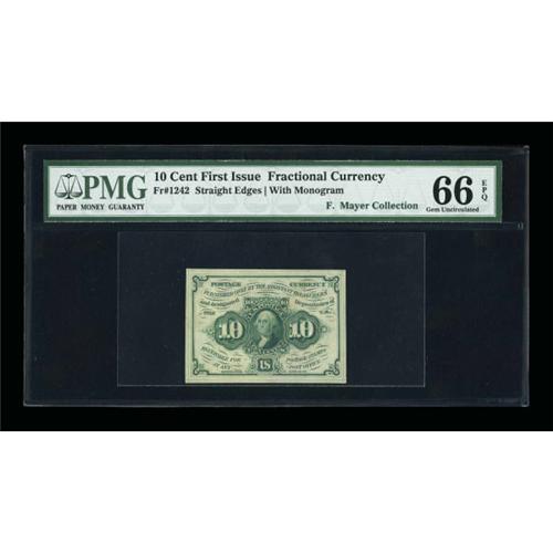 <B>Fr. 1242 10¢ First Issue PMG Gem Uncirculated 66 EPQ.</B></I> Another hugely margined, beautifully bright, original example cut to preserve its margins. (750-up)<BR><I>From The Frederick Mayer Collection</B></I><BR><BR><b>Shipping:</b> Coins & Currency (<a target="_blank" href="http://www.heritageauctions.com/common/shipping.php">view shipping information</a>)
