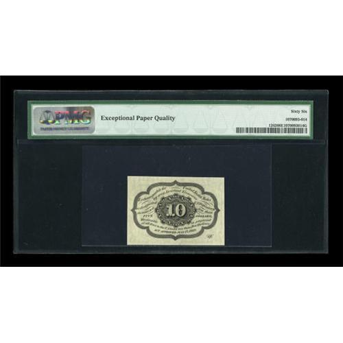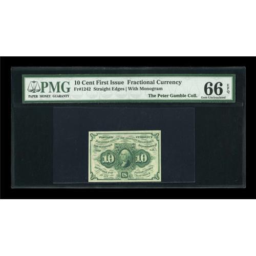 <B>Fr. 1242 10¢ First Issue PMG Gem Uncirculated 66 EPQ.</B></I> The margins are beautifully broad on this clearly original, fully colored, straight edge with monogram 10¢ piece. It is common enough in most grades, but seldom seen at this level.<BR><I>From The Peter Gamble Collection.</B></I><BR><BR><b>Shipping:</b> Coins & Currency (<a target="_blank" href="http://www.heritageauctions.com/common/shipping.php">view shipping information</a>)