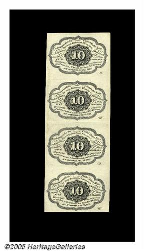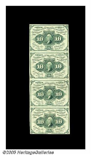 <B>Fr. 1242 10¢ First Issue Vertical Strip Of Four About New.</B></I> The strip grades About New due to a fold between the second and third subject, but each of the notes individually grades fully Choice.