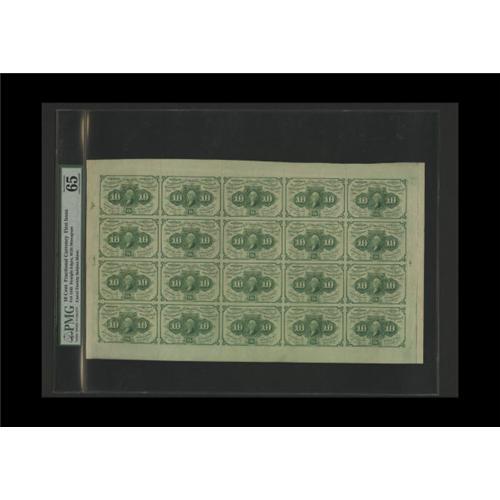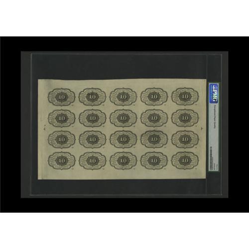 <B>Fr. 1242 10c First Issue Complete Sheet of Twenty PMG Gem Uncirculated 65 EPQ.</B></I> A truly lovely fractional sheet that PMG has graded Gem and added the comment "Exceptional Paper Quality". The colors are perfect and through the third party holder we can certainly see no reason not to concur with PMG's assessment that this is indeed a gem sheet.