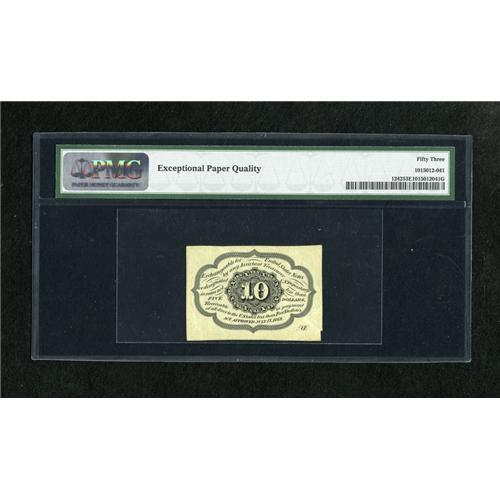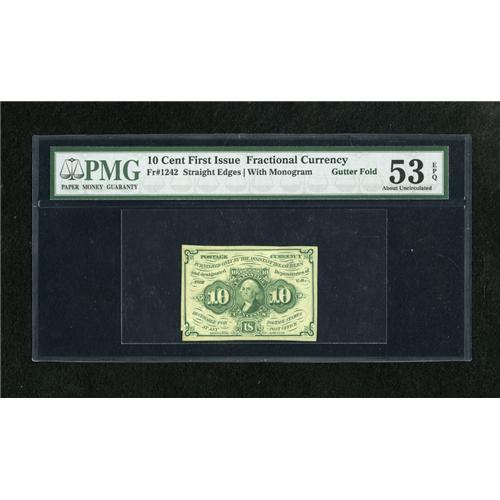 <B>Fr. 1242 10c First Issue PMG About Uncirculated 53 EPQ.</B></I> A generally unassuming note that is lightly circulated and well margined. The value of this piece lies in the broad diagonal gutter fold that traverses most of the note's surfaces.<BR><BR><b>Shipping:</b> Coins & Currency (<a target="_blank" href="http://www.heritageauctions.com/common/shipping.php">view shipping information</a>)