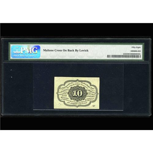 <B>Fr. 1242 10c First Issue PMG Choice About Unc 58.</B></I> PMG has commented "Maltese Cross on Back by Levick." Levick was a turn-of-the-century dealer who had the annoying (or charming, depending on your point of view) habit of creating his own Fractional varieties with a number of rubber stamps, dyes, etc. The Maltese Cross in the lower left corner on the back of this note was one of his devices. A highly collectible and interesting Fractional artifact.