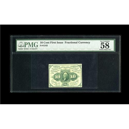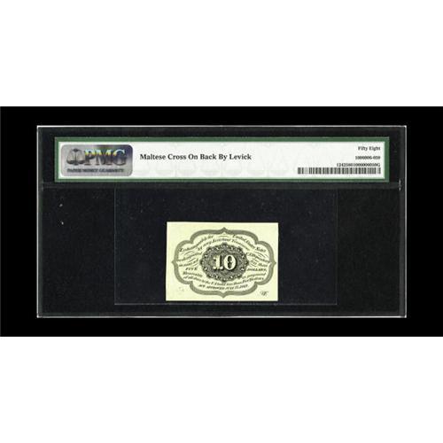 <B>Fr. 1242 10c First Issue PMG Choice About Unc 58.</B></I> PMG has commented "Maltese Cross on Back by Levick." Levick was a turn-of-the-century dealer who had the annoying (or charming, depending on your point of view) habit of creating his own Fractional varieties with a number of rubber stamps, dyes, etc. The Maltese Cross in the lower left corner on the back of this note was one of his devices. A highly collectible and interesting Fractional artifact.