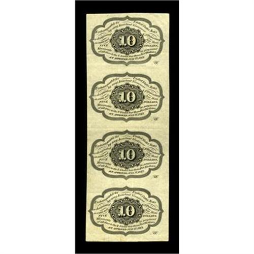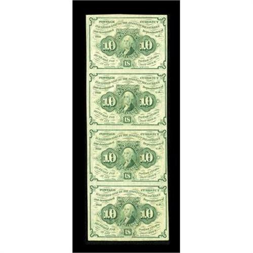 <B>Fr. 1242 10c First Issue Vertical Strip of Four About New.</B></I> A lovely vertical strip of four which is bright and colorful with some light horizontal folds from where it was folded up.
