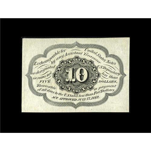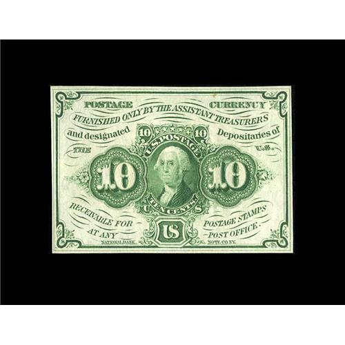 <B>Fr. 1243 10¢ First Issue Very Choice New.</B></I> The margins are just a bit too tight for the Gem grade, but this scarce, straight-edge, no-monogram example has perfect back centering, excellent color, good paper surfaces and all the other attributes of a Gem piece.<BR><I>From The Jacob and Heather Dedman Collection</B></I><BR><BR><b>Shipping:</b> Coins & Currency (<a target="_blank" href="http://www.heritageauctions.com/common/shipping.php">view shipping information</a>)