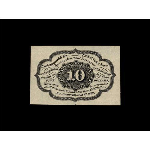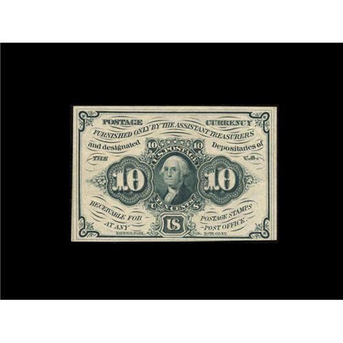 <B>Fr. 1243 10c First Issue Choice New.</B></I> Perfect eggshell paper and a perfectly centered back are hindered only by a lower margin that is cut a bit too tight.