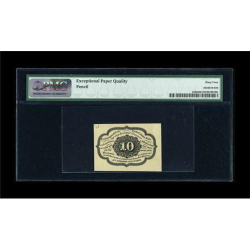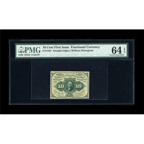 <B>Fr. 1243 10c First Issue PMG Choice Uncirculated 64 EPQ.</B></I> An exceptional, high grade example of this much scarcer straight edge no monogram variety. This is a number that is much more available up to the Choice CU grade but then becomes increasingly challenging to find as a gem. PMG notes "Pencil" on the holder as there is an old catalog number on the back.<BR><BR><b>Shipping:</b> Coins & Currency (<a target="_blank" href="http://www.heritageauctions.com/common/shipping.php">view shipping information</a>)