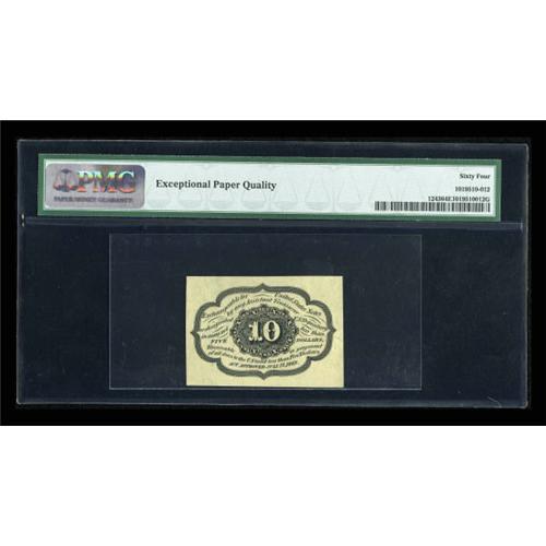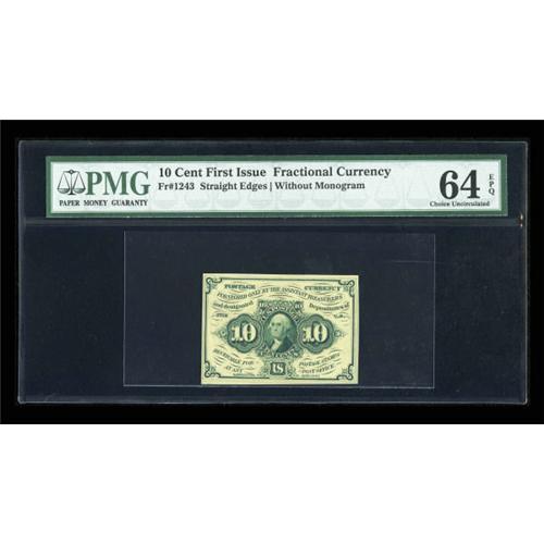 <B>Fr. 1243 10c First Issue PMG Choice Uncirculated 64 EPQ.</B></I> This is the scarce straight edge, no-monogram variety. It is a very nice example of the type, with razor-sharp print quality, perfect back centering and good margins all around the face.<BR><BR><b>Shipping:</b> Coins & Currency (<a target="_blank" href="http://www.heritageauctions.com/common/shipping.php">view shipping information</a>)