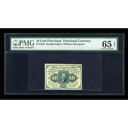 <B>Fr. 1243 10c First Issue PMG Gem Uncirculated 65 EPQ.</B></I> PMG has graded 34 Fr. 1243s with only two of them above the level of this pretty piece.<BR><BR><b>Shipping:</b> Coins & Currency (<a target="_blank" href="http://www.heritageauctions.com/common/shipping.php">view shipping information</a>)