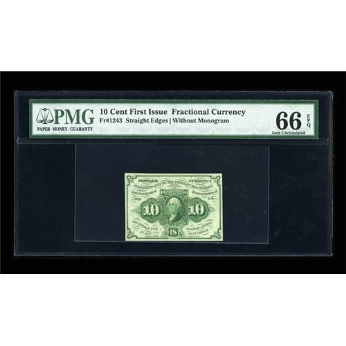 <B>Fr. 1243 10c First Issue PMG Gem Uncirculated 66 EPQ.</B></I> An excellent without monogram issue that boasts Exceptional Paper Quality.<BR><BR><b>Shipping:</b> Coins & Currency (<a target="_blank" href="http://www.heritageauctions.com/common/shipping.php">view shipping information</a>)