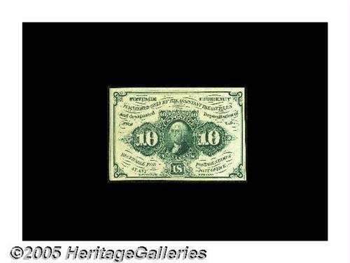 <B>Fr. 1243 Milton 1R10.1a 10¢ First Issue Very Choice New.</B></I> One of the two Milton varieties of Fr. 1243 in the definitive O'Mara Collection. This one has the darker green ink. As with virtually every note in the collection, it's a sharply printed, gorgeous piece with incredible eye appeal. Held from the top grade only by somewhat narrow margins at the bottom and right, neither of which touches the frame line at any point.