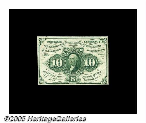 <B>Fr. 1243 Milton 1R10.1e 10¢ First Issue Inverted Back Choice New.</B></I> A wonderful combination of high grade and extreme rarity. In 1978, only two pieces were known, but the present census at the time of Tom's 2002 article was four. <I>ex-F.T. Joers Collection, 1977; CAA MRF 1/97; to Tom O'Mara.</B></I>