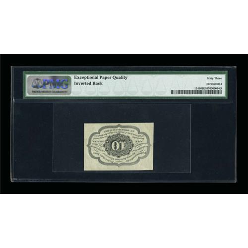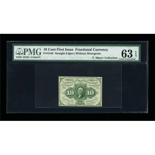 <B>Fr. 1243 Milton 1R10.1e 10¢ First Issue Inverted Back PMG Choice Uncirculated 63 EPQ.</B></I> Purchased by Mr. Mayer from our May 2005 sale of the O'Mara Collection for $1680 on a $1500 estimate. We described it there, "A wonderful combination of high grade and extreme rarity. In 1978, only two pieces were known, but the present census at the time of Tom O'Mara's 2002 article was four. (2250-up)<BR><I>ex-F.T. Joers Collection, 1977; CAA MRF 1/97; CAA Tom O'Mara 5/05.</B></I><BR><I>From The Frederick Mayer Collection</B></I><BR><BR><b>Shipping:</b> Coins & Currency (<a target="_blank" href="http://www.heritageauctions.com/common/shipping.php">view shipping information</a>)