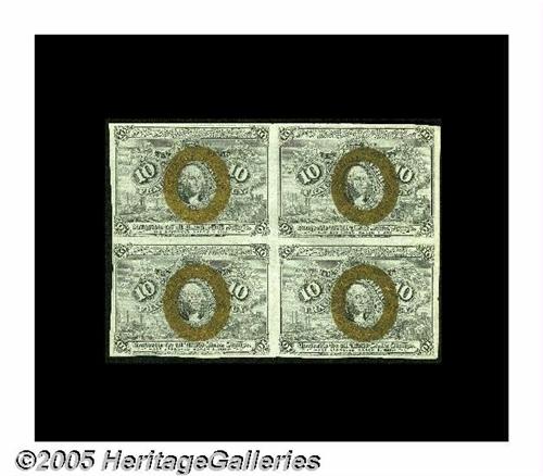 <B>Fr. 1244 10¢ Second Issue Block Of Four Choice New.</B></I> There is a little handling at the top margin but all four notes are beautifully bright and essentially Choice New.