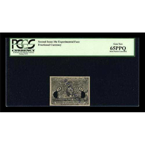 <B>Fr. 1244 10c Second Issue Experimental Face PCGS Gem New 65PPQ.</B></I> Broad margins are noted for this Experimental issue. The paper quality is pleasing and the originality is easily visible through the holder.<BR><BR><b>Shipping:</b> Coins & Currency (<a target="_blank" href="http://www.heritageauctions.com/common/shipping.php">view shipping information</a>)