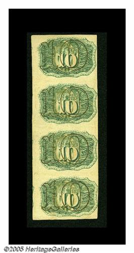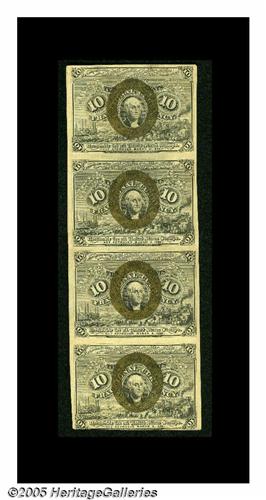 <B>Fr. 1244 10c Second Issue Vertical Strip of Four.</B></I> The paper is lightly aged and there is a fold between the two center notes. Back plate number 173 is clearly seen. All four notes grade <B>New.</B></I>