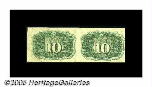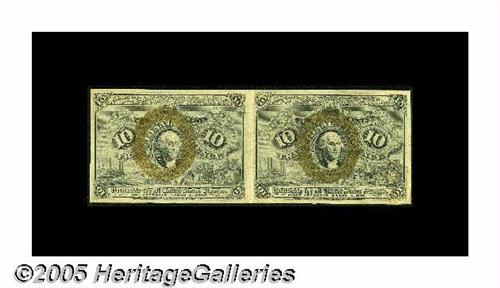 <B>Fr. 1244 Milton 2R10.1g 10¢ Second Issue Treasury Rectangle Horizontal Pair About New.</B></I> The great majority of the rectangle is on the face of the right-hand note in its lower-right corner. The full "Treas. Dp," and three entire sides of the rectangle are fully on the note. Only the "t" and the right-hand edge of the rectangle are missing.