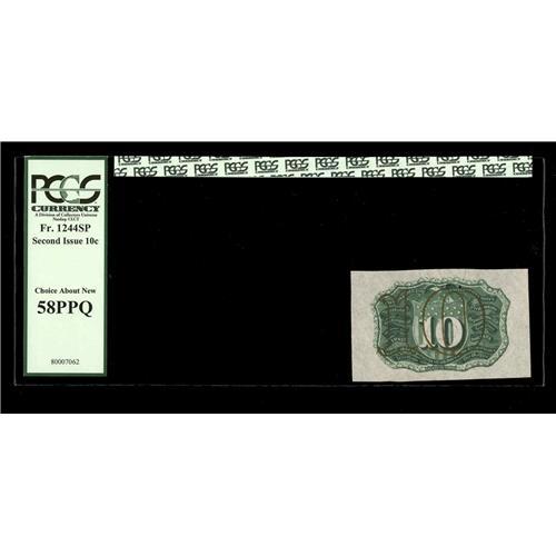 <B>Fr. 1244SP 10c Second Issue Narrow Margin Reverse PCGS Choice About New 58PPQ.</B></I> The paper quality is definitely there, but a slight corner bump is visible.