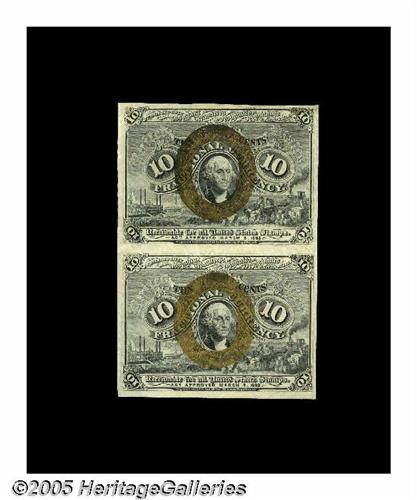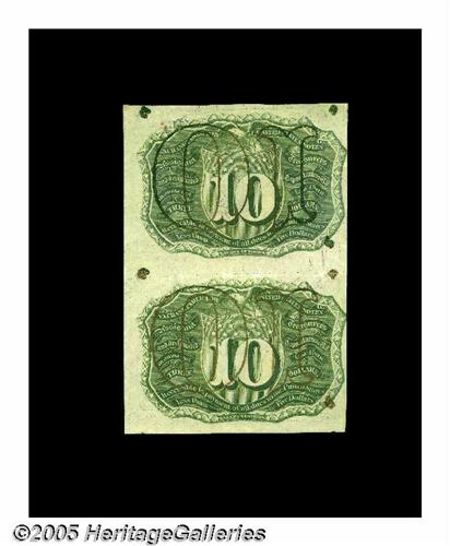 <B>Fr. 1246 Milton 2R10.3c 10¢ Second Issue Inverted Back Engraving Vertical Pair Choice New.</B></I> A beautiful high grade invert multiple that is just a touch of handling away from the Gem grade. A block of nine appeared in a 1894 Chapman Sale and we suspect that the known multiples of this number all trace back to that block. In any event, invert multiples are extremely rare and highly collectible.