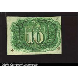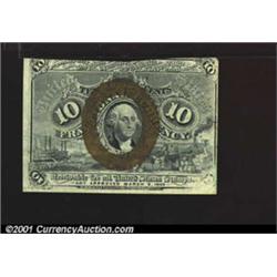 Fr. 1247 10c Second Issue New.<p>Cut into the design at the top and weakly printed at the bottom right, but the important "1" in the surcharge is extremely sharp and clear, including its well defined split foot. That is undoubtedly why this otherwise ordinary example of this scarce number was acquired. Important notice: We expect to be auctioning lots at the rate of 200-250 per hour. Sometimes eBay Premier live bid software cannot keep up with that pace, so we strongly recommend that you place a realistic proxy bid now as insurance to avoid disappointment. Also please note that all Heritage/CAA lots purchased through eBay Premier carry a 20% Buyer's Premium.