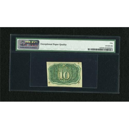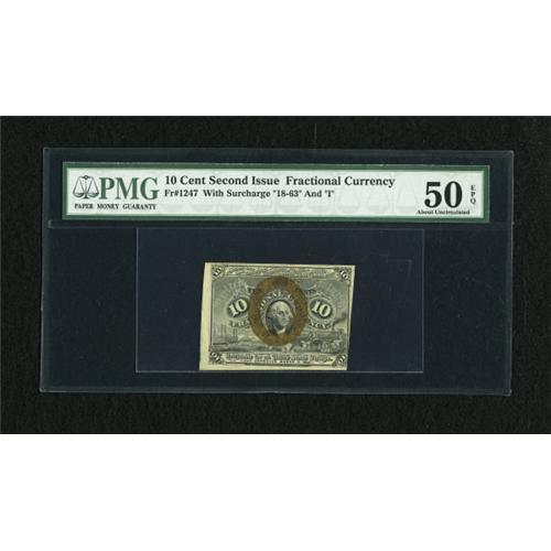 <B>Fr. 1247 10c Second Issue PMG About Uncirculated 50 EPQ.</B></I> Bright bronzing, good embossing and razor sharp surcharges are found on this scarcer note that is in an uncommonly seen grade.<BR><BR><b>Shipping:</b> Coins & Currency (<a target="_blank" href="http://www.heritageauctions.com/common/shipping.php">view shipping information</a>)