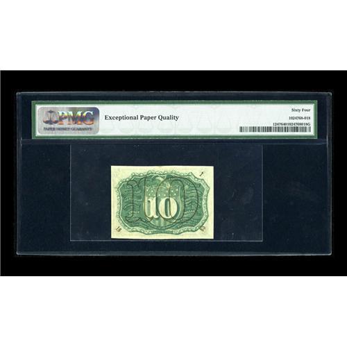 <B>Fr. 1247 10c Second Issue PMG Choice Uncirculated 64 EPQ.</B></I> This is an exceptional near gem example of this much scarcer number with "1-18-63" surcharges clearly defined on the back. The bronze overprint is bright and luminescent with great embossing clearly visible. In our recently completed Signature Auction a Choice New example realized a total of $575 after spirited bidding.<BR><BR><b>Shipping:</b> Coin/Currency (<a target="_blank" href="http://www.heritageauctions.com/common/shipping.php">view shipping information</a>)